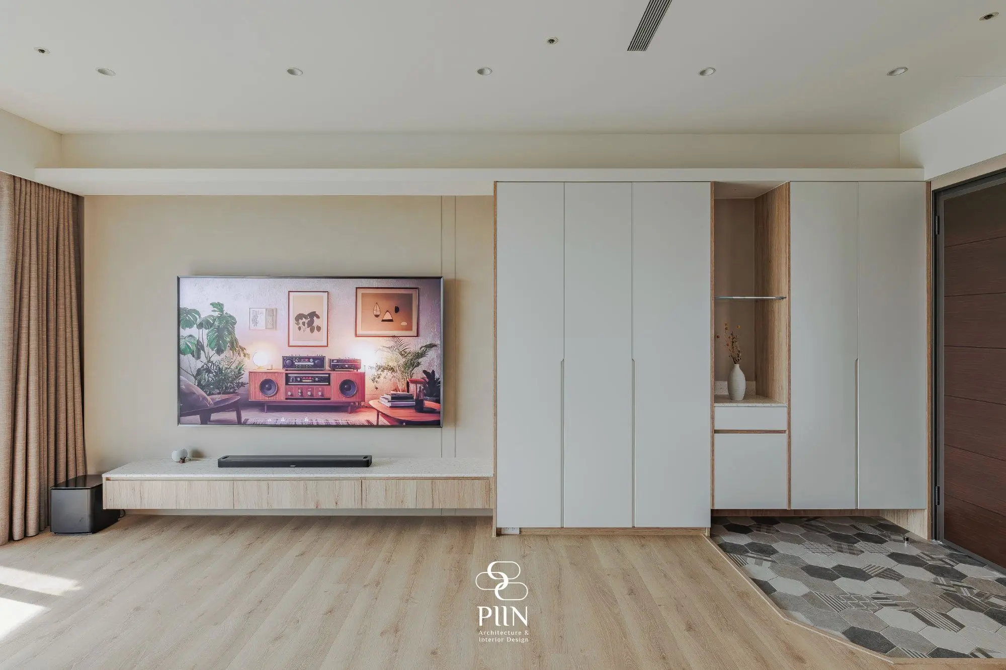 空間透過低彩度色系建立一致性,使視覺維持平衡與安定。牆面比例簡單,使空間保有留白餘裕。大面採光使室內光線均勻散布,呈現舒適的生活節奏。透過簡化設計元素,使空間更顯純粹。