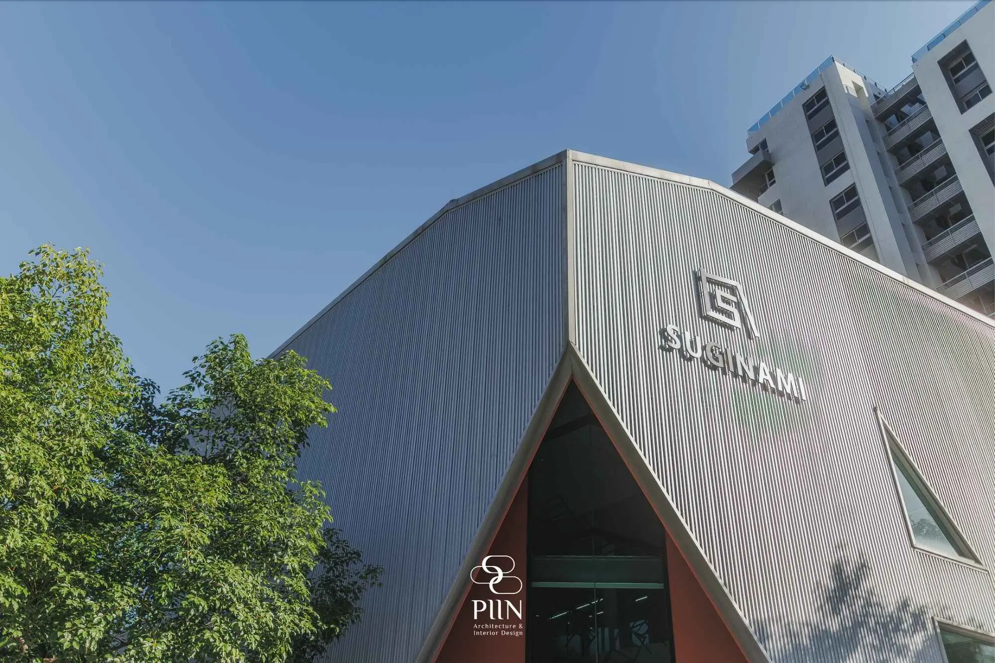 外立面以俐落線條展現日式建築的克制與精準,搭配磚紅色石頭漆作為跳色,為建築注入一抹鮮明而沉穩的亮意。