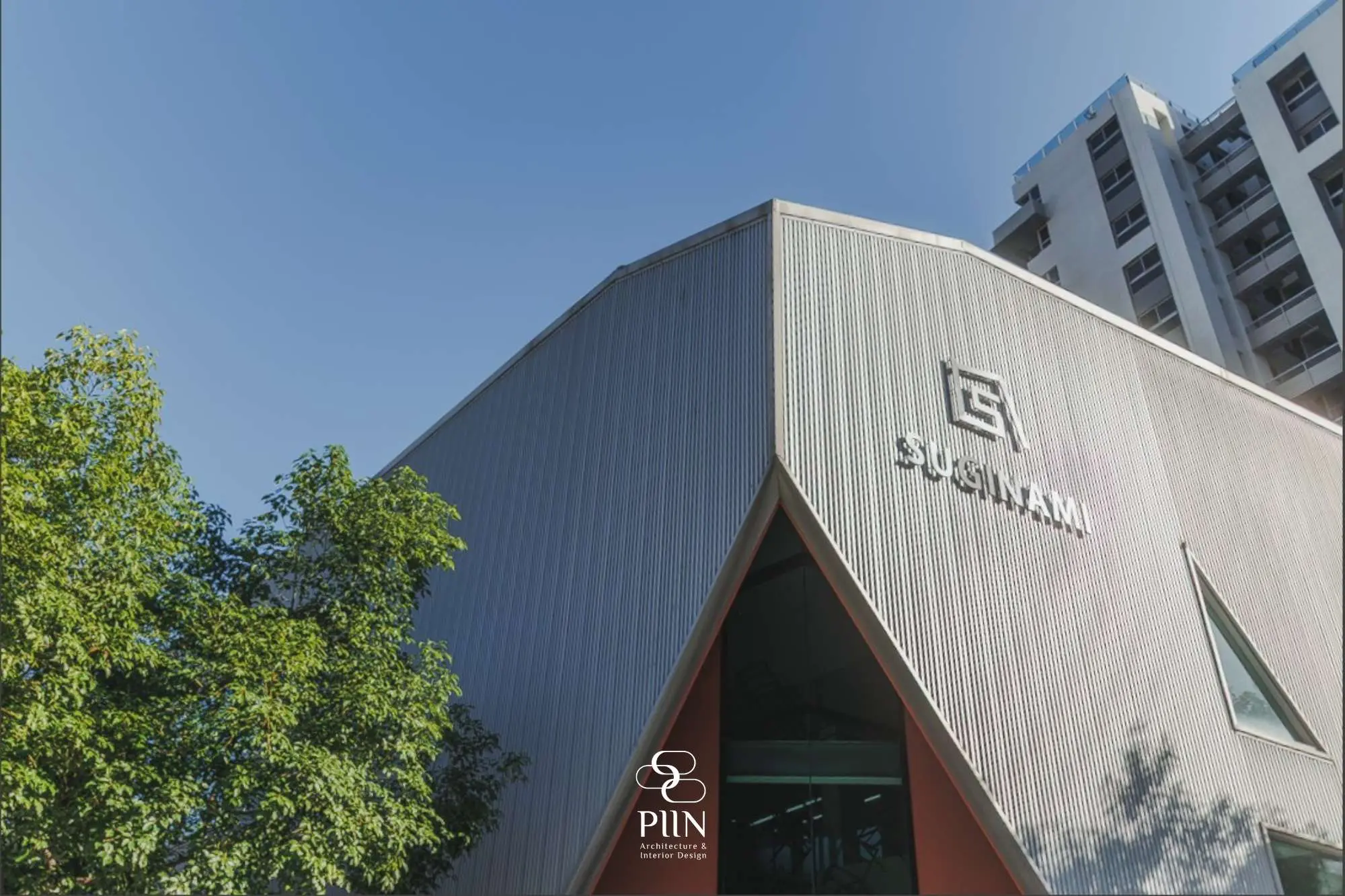外立面以俐落線條展現日式建築的克制與精準,搭配磚紅色石頭漆作為跳色,為建築注入一抹鮮明而沉穩的亮意。