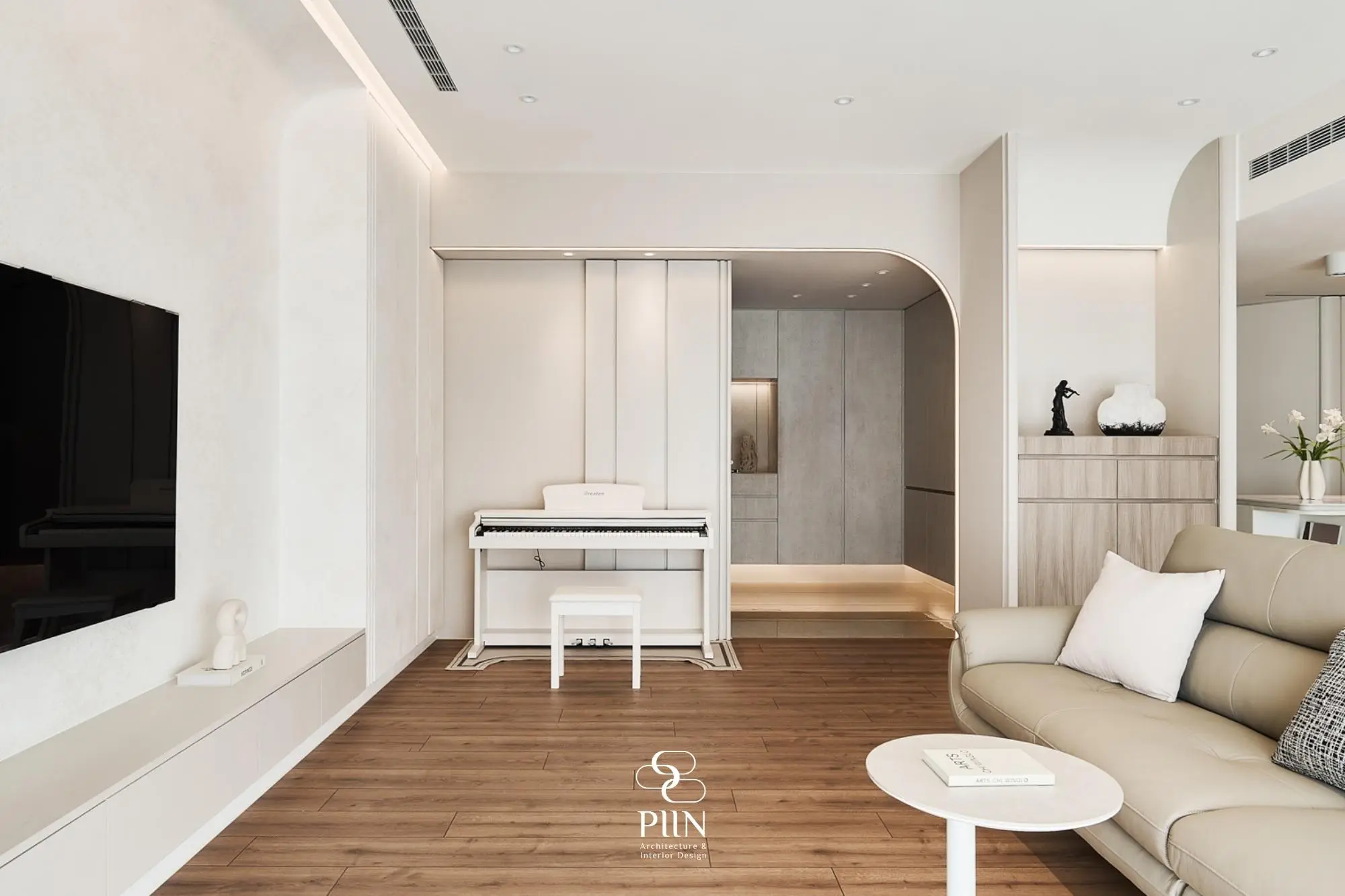 弧形線條在過渡區域中延續,與電視牆及側邊框架形成柔和對話,讓視線自然流動。木作牆面以 #鄉居 淺米色烤漆鋪陳,於白色背景中添上一抹溫暖氣息。