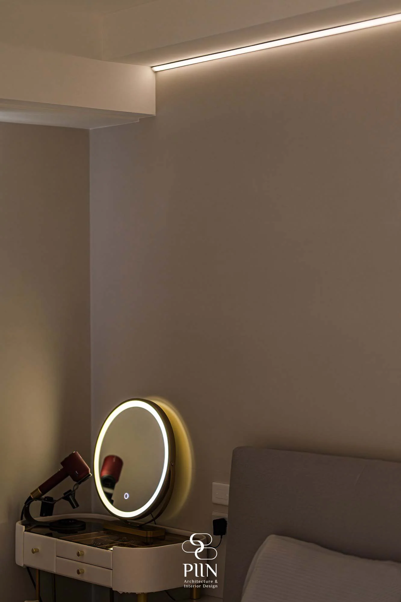 床頭上方設置可調整色溫的燈光,無論是溫暖柔和的黃光,或是清晰明亮的白光,都能依照情境與心情自由轉換。