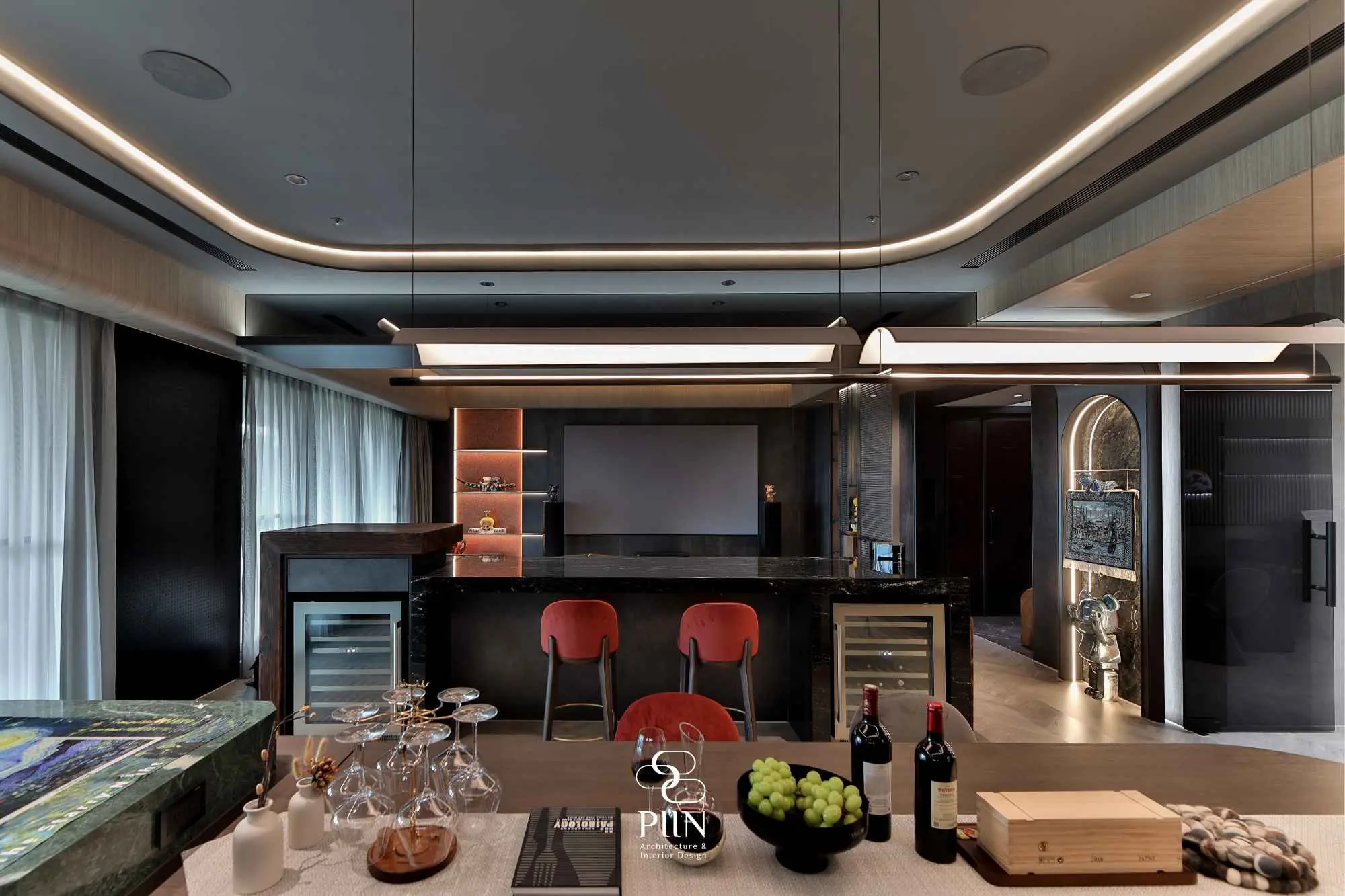 空間同時承載工作與休閒,拆除原有牆面後,以灰玻與展示層架重新界定邊界,讓半開放式格局保有視線穿透。弧形曲線搭配線性光源,輕輕圍繞展示區域,使藝術陳列成為空間的一部分。